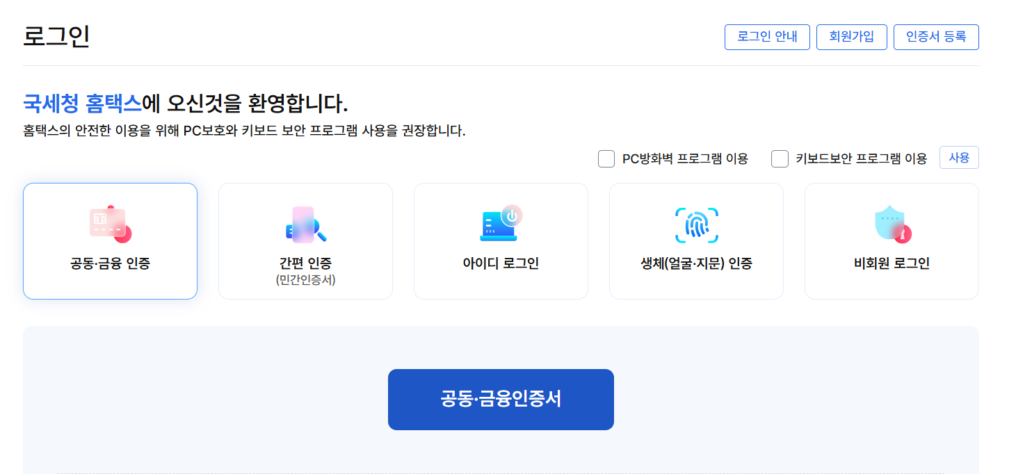 로그인: 공동인증서, 금융인증서, 간편인증(카카오, PASS 등)으로 로그인