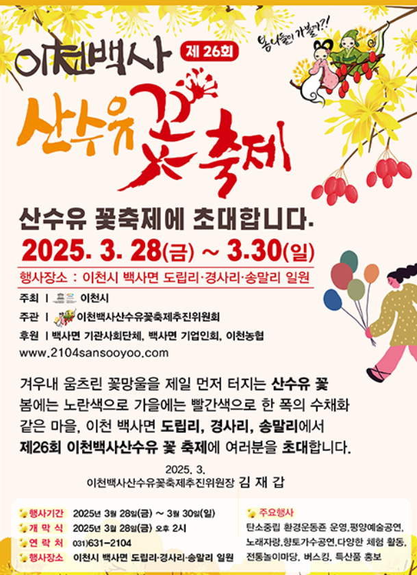 - 장소: 경기도 이천시 백사면 산수유마을 일대