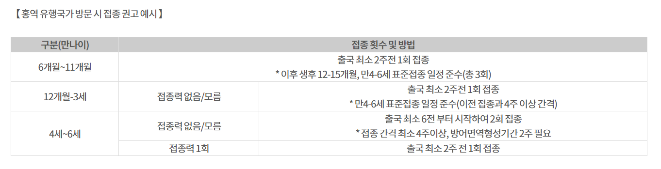 - 여행 최소 4주 전 접종 완료 추천 (면역력 형성까지 최소 2주 소요)